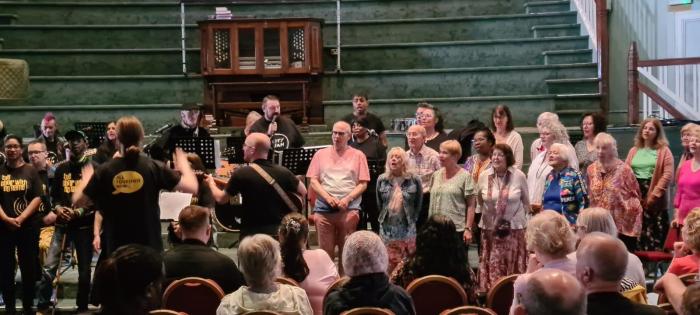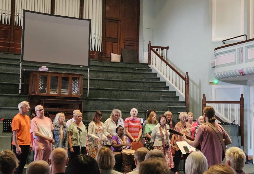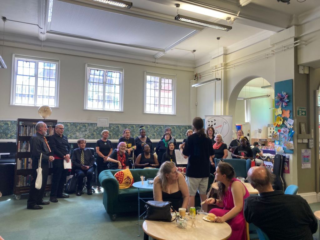 On the 4th of October, Sing For Change had their first singing workshop funded by the National Lottery, giving people a chance to sing and see what Sing For Change is all about. We had a lovely surprise when 25 of our current members were joined by 25 new people. Joe, our choir leader, rose magnificently to the occasion teaching us all two new songs followed by lunch and a rousing chorus of Bella Ciao.