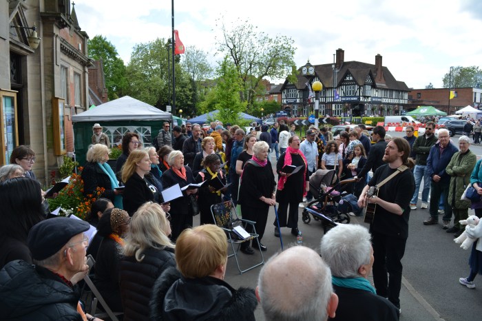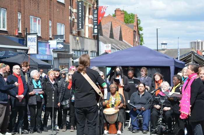 We had two opportunities to sing at this year’s Earlsdon Festival. First, on the pavement outside the Library (first pic); secondly in the Festival’s performance space (second pic).